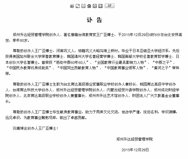 关于尊敬的创办人王广亚博士逝世的讣告