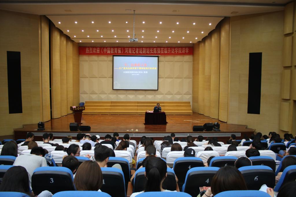 应我校王广亚研究中心邀请,5月21日下午14:30分,《中国教育报》河南记者站副站长,河南教育报刊社编审,《河南教育(职成教版)》终审,河南省教育厅学术技术带头人陈强莅临我校,在艺术楼音乐厅为近五百名本科生作了《干,出美好人生——王广亚先生务实苦干精神给我们的启迪》专题报告。与会领导和老师分别是常务副校长崔慕岳、副校长张金安、院办主任朱永恒、科研处处长杨存博、党委宣传部陈军老师及王广亚研究中心工作人员。报告会由常务副校长崔慕岳主持。