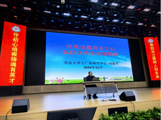 刘道兴院长以《传承范蠡商圣文化弘扬优秀企业家精神》为题,围绕“二十届三中全会弘扬企业家精神,加快建设更多世界一流企业”,从范蠡的传奇人生及其对后世影响、经商实践和商业思想、弘扬范蠡商圣文化三方面作了详细讲解,感叹早在2500年前,范蠡就能对商业有如此系统的认识和理论建树,使学生多角度了解“商圣”范蠡。他指出通过大力弘扬商圣文化,正确认识经商办企业的伟大和崇高,正确认识企业家精神的高尚,正确认识企业家的社会地位和责任,大力倡导新时代企业家要敢于担当,勇于创新,严于律己,依法经营,注重诚信,勤俭节约,使自己的企业稳健经营,百年不败。