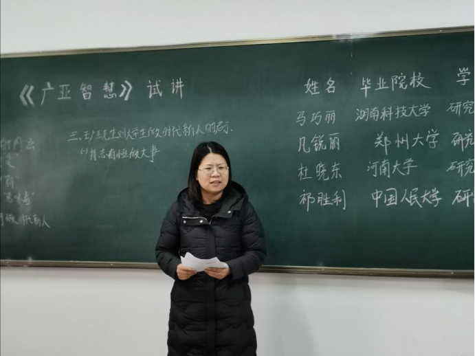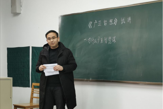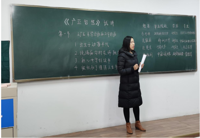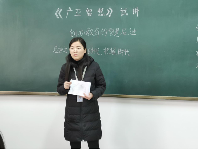 为培养青年教师对创办人王广亚博士教育精神的传承和积极推动《广亚智慧》课程改革,规范课程管理,提高教学效果,王广亚研究中心于2020年1月14日下午14点30分,在综合楼203教室组织《广亚智慧》课程试讲,评委成员有马克思主义学院窦峰书记、教务处程敏姿科长、人事处殷玉玲科长、科研处冯艳艳科长,由王广亚研究中心办公室主任彭丽副教授主持,保障本次试讲有序开展。