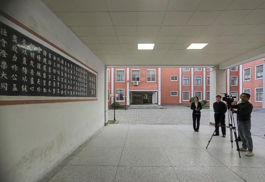 辛世俊教授在综合教学楼向河南广播电视台《文化河南》制片人黄喜东介绍了“升达大学治家格言”,他将创办人拟定的“清早起、扫庭院,惜晨光、勤读书……尽我力、作公益,社会隆、乐大同”教育治家格言以故事情节娓娓道来,体现出创办人为了让学生养成良好行为习惯、形成高尚品德,在校园中践行传统文化的良苦用心。