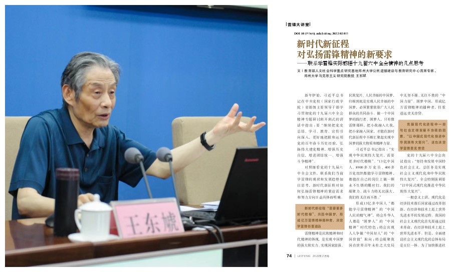 2022年2月,王教授在雷锋杂志发表题为《新时代新征程对弘扬雷锋精神的新要求——联系学雷锋实际感悟十九届六中全会精神的几点思考》的文章。王教授以新时代传承和弘扬雷锋精神对民族复兴的意义展开论述,一方面强调雷锋精神就是民族精神和时代精神的体现,是实现中国梦的强大软实力;另一方面强调新时代传播雷锋精神,对于遏制拜金主义、享乐主义、极端个人主义等错误思潮的重大意义。