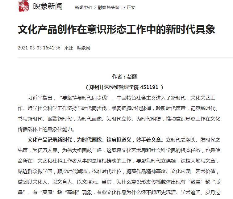 2021年3月,彭丽副主任在映象网发表题为《文化产品创作在意识形态工作中的新时代具象》的文章。文章提出文化文艺工作、哲学社会科学工作与时代同步伐,就要把握时代脉搏,聆听时代声音,记录新时代、书写新时代、讴歌新时代,为时代画像、为时代立传、为时代明德,推动意识形态工作在文化传播载体上的具象化能力。该文章强调了意识形态对于文化产品创作的引领性,时代精神与文化产品创作的统一性。文化产品创作要讴歌党、讴歌祖国、讴歌人民、讴歌英雄,代表时代风貌、引领时代风气;要弘扬中国精神、中国价值、中国力量,为党和人民提供精神激励;要传播当代中国价值观念、体现中华文化精髓、反映中国人审美追求,丰富人们精神世界、增强人们精神力量、提升人们精神境界。