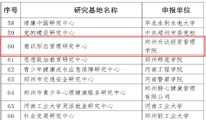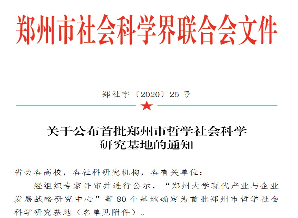 近日,郑州市社会科学界联合会下发《关于公布首批郑州市哲学社会科学研究基地的通知》(郑社字〔2020〕25号)文件,我校申报的“意识形态管理研究中心”被市社科联确定为郑州市首批哲学社会科学研究基地。
