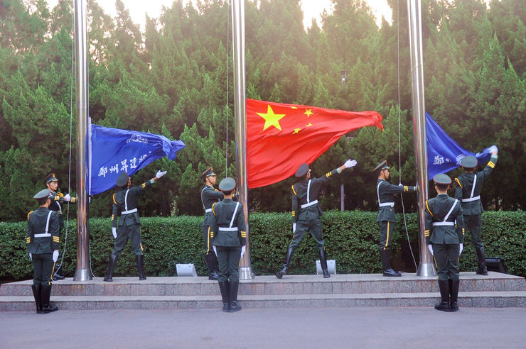 6点20分,广播首先播送了《郑州升达经贸管理学院国旗教育实施办法》和院国旗班简介。6点27分,院国旗班身着统一礼服,英姿飒爽,迈着整齐矫健的步伐护送着鲜艳的五星红旗和校旗向旗台走来。6点30分,当嘹亮的国歌声响起,随着护旗手的有力甩旗,鲜艳的五星红旗和校旗,伴着朝霞,沐浴着晨风冉冉升起,在这神圣的时刻,一颗颗赤子之心被深深地震撼,冉冉升起的旗帜,既象征着祖国不断繁荣昌盛,也昭示着升达学院蒸蒸日上的发展前景。大家自觉向国旗行注目礼,表达对祖国的热爱与骄傲之情,并在内心祝愿祖国、祝愿升达明天更加美好。仪式场面庄重严肃、气势恢宏,给2016级新生们上了一堂生动真切的爱国主义教育课。