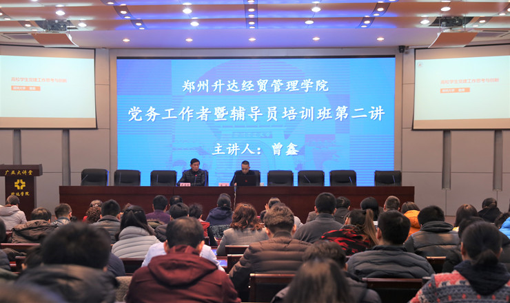 12月13日下午,我院在国际会议厅举行党务工作者和辅导员培训班第二讲专题培训。本讲培训邀请了2016年全国高校辅导员年度人物提名奖获得者、河南省优秀辅导员、郑州大学辅导员曾鑫作题为《高校学生党建工作思考与创新》的专题报告。党委副书记戎庭银同志主持培训。