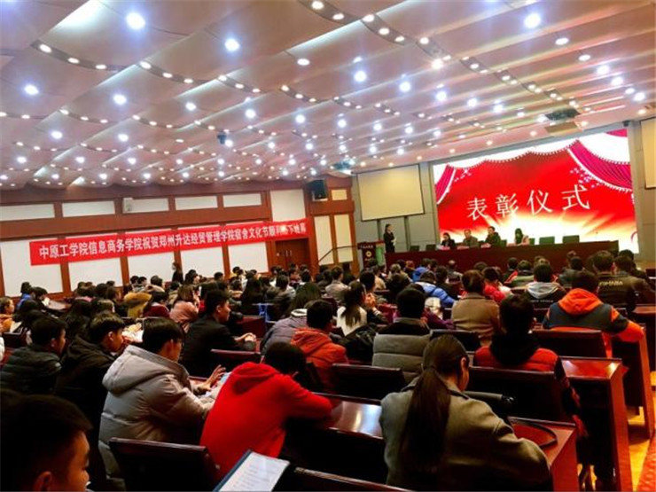 12月8日下午,我校第十一届宿舍文化节颁奖仪式在行政楼国际会议厅顺利举行。学务处张现水学务长、校团委李松涛科长、宿管科刘玉梅科长、河南省机电职业学院和中原工学院信息商务学院自律委员会学生代表、校学生会闫苗苗副主席出席了此次大会。学生宿舍楼管理员、各学院学生干部、及获奖学生代表140余人参加了大会。