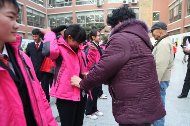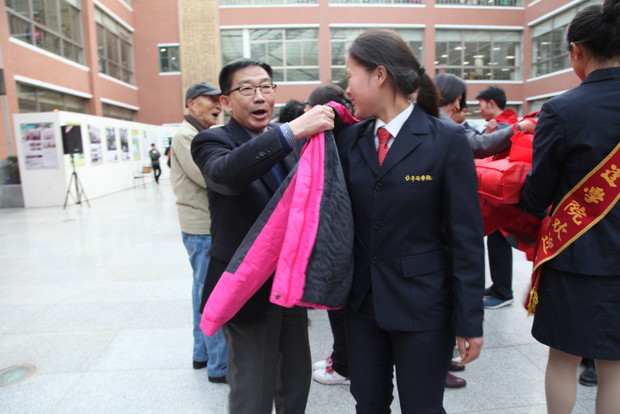 首先,参加此次活动的领导分别为20位受助学生代表分发“爱心棉衣”,并帮其着装整理。然后,受助学生代表会计系涉外二班赵肖倩发言。她深情感谢创办人在寒冬中为家境贫寒、求学理想坚定的学生送来棉衣,她代表受助同学表示:珍惜创办人及学院领导为我们创造的这个平台,全方位提高自己,力争做一个符合时代要求的优秀大学生!毕业后,回报社会,为升达争光。