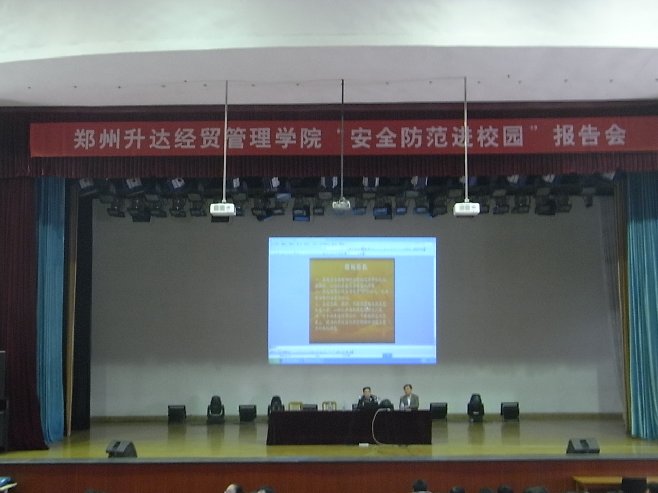 10月20日下午,我院邀请郑州市公安局便衣警察支队田国辉副支队长在思源会馆作了“安全防范进校园”主题报告,各系行政秘书、辅导员、总务处保卫科同仁、教学楼、宿舍楼管理员和2011级新生两千余人参加了报告。