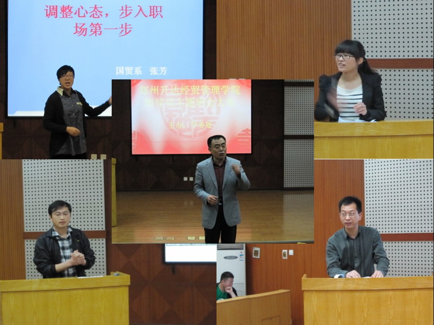 在决赛中,6名老师分别围绕自己的班会主题和同学们探讨了考研的心路历程、如何掌握身体语言、人生追求、人生规划、如何正确认识大学等和学生养成教育、素质培养相关的问题。他们的班会主题鲜明、观点正确、内容翔实,PPT制作精美,紧密联系学生和班级实际,符合学生的身心特征和思想认识水平,具有一定的说服力和表现力,赢得了现场观众的阵阵掌声。相关系的党政领导,分别对6位辅导员的主题班会进行了现场点评,既肯定了成绩,也指出了不足。最后经过7名评委的评定,文法系郭青梅荣获一等奖,资讯系李磊、外语系王娟荣获二等奖,国贸系丁玥、郭晓林和企管系许广庆荣获三等奖,另有其他系的10名辅导员获得优秀奖。
