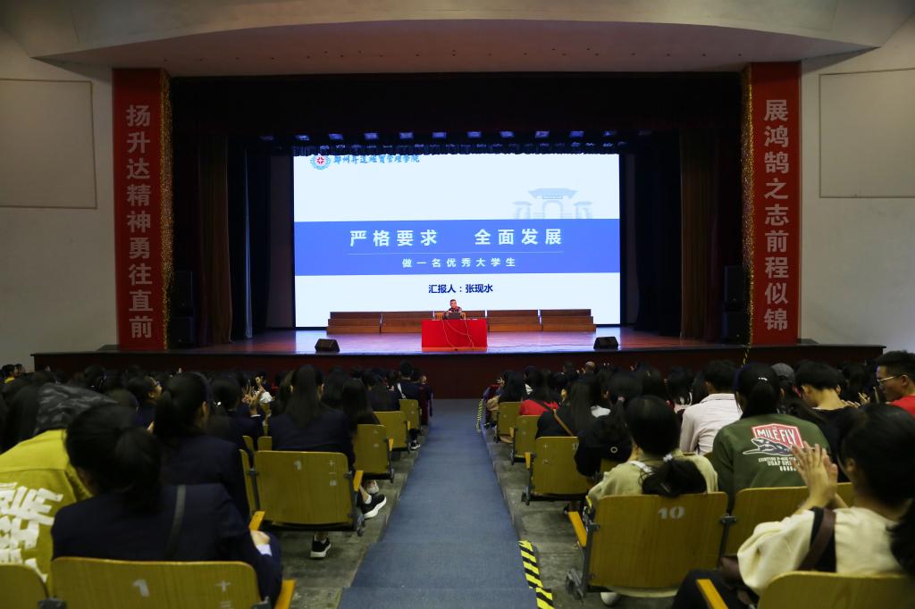 9月27日上午,张现水学务长以《严格要求全面发展做一名优秀大学生》为题,在思源会馆为我校2018级新生作了精彩的入学教育报告。我校2018级全体新生、新生班辅导员共同聆听了学务长的报告。