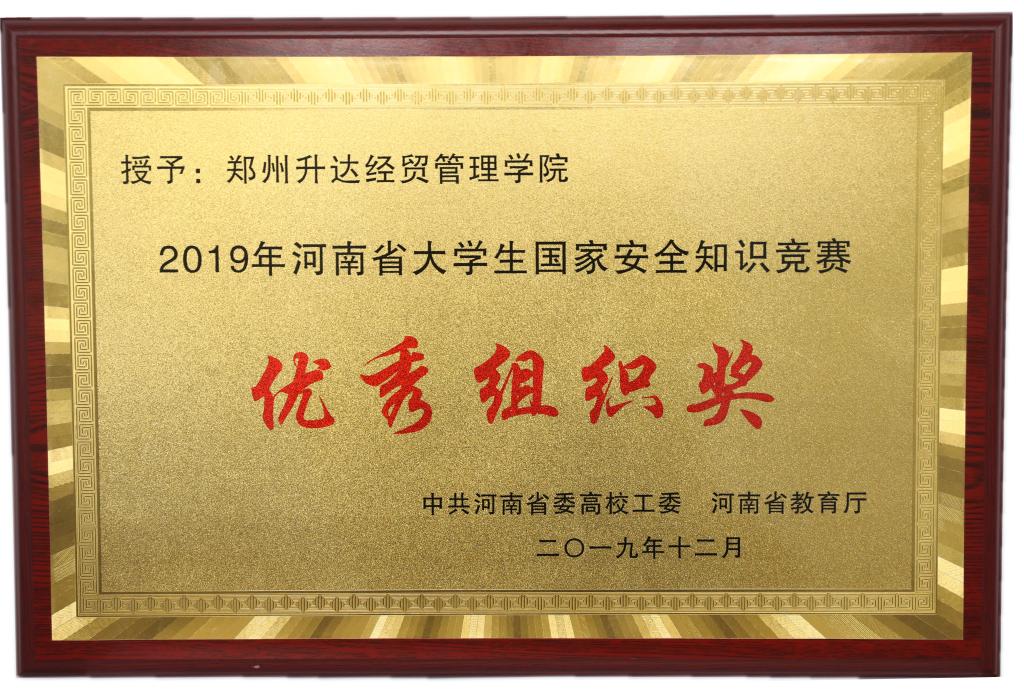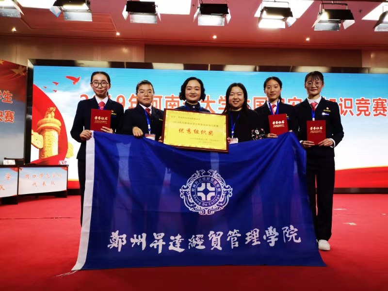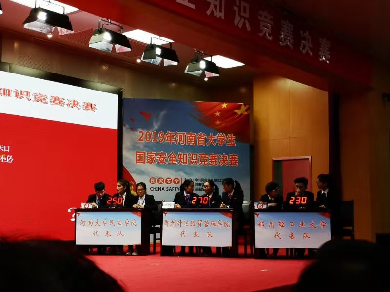12月15日-12月16日, 2019年河南省大学生国家安全知识竞赛决赛在河南财经政法大学举行。我校由文法学院解庆婷、曹灿灿、外国语学院张雅迪、管理学院方雨4名同学组成的代表队,在文法学院行政秘书郑玲玲、辅导员李玉杰带领指导下,积极参赛、沉着应战,与郑州大学等9所高校的选手展开激烈角逐,最终取得第二名的好成绩。我校同时荣获优秀组织奖,郑玲玲、李玉杰两位老师荣获优秀指导老师奖。