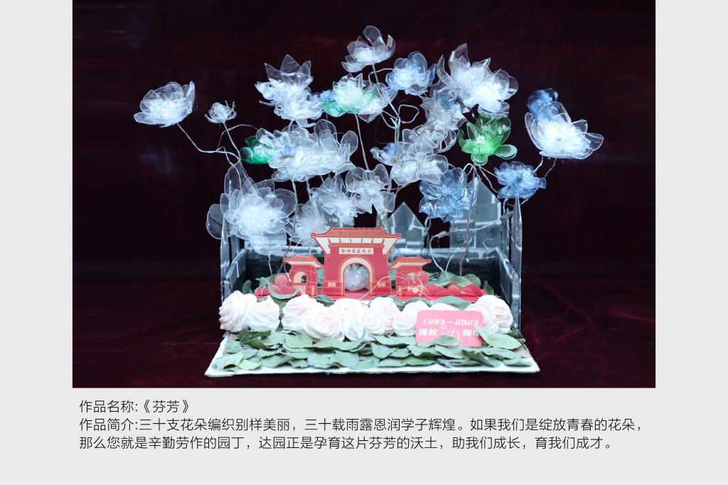 本次展览内容为2023级本、专科学生在《劳动通论》课程专题三“马克思劳动价值论与劳动中常见的经济现象”的课后作业,作品以“劳动创造价值”为主题,结合我校建校三十周年校庆,以小组为单位协作完成。同学们在作品创作过程中充分展现了巧思妙想的劳动创新精神和群策群力的团队协作意识,通过作品表达了对学校的美好祝福。
