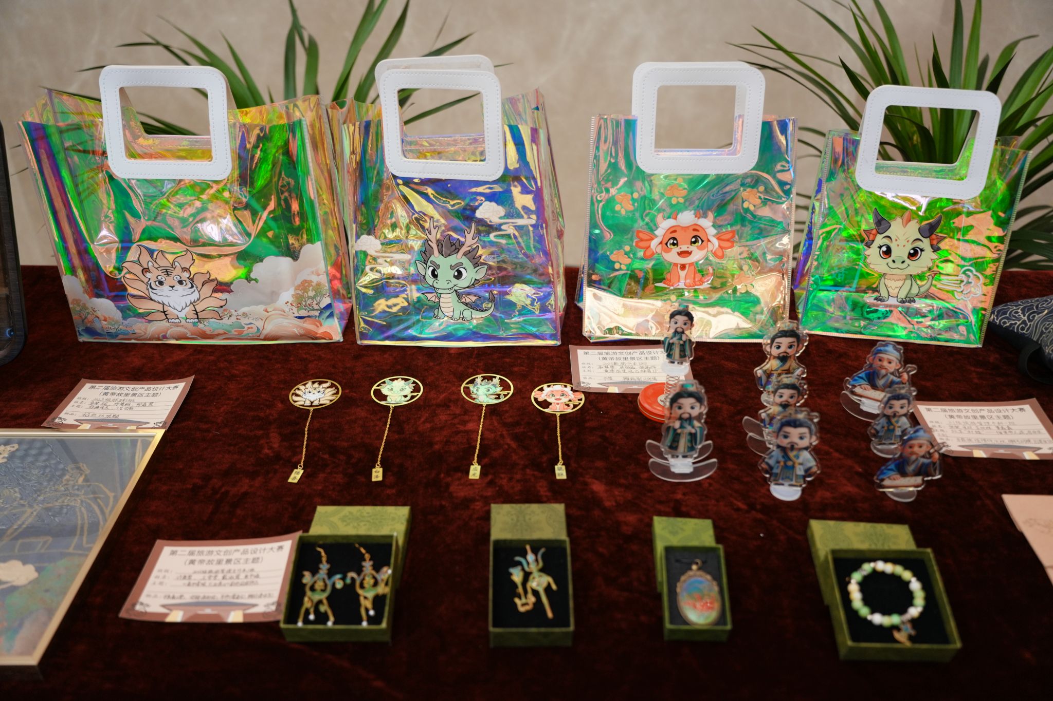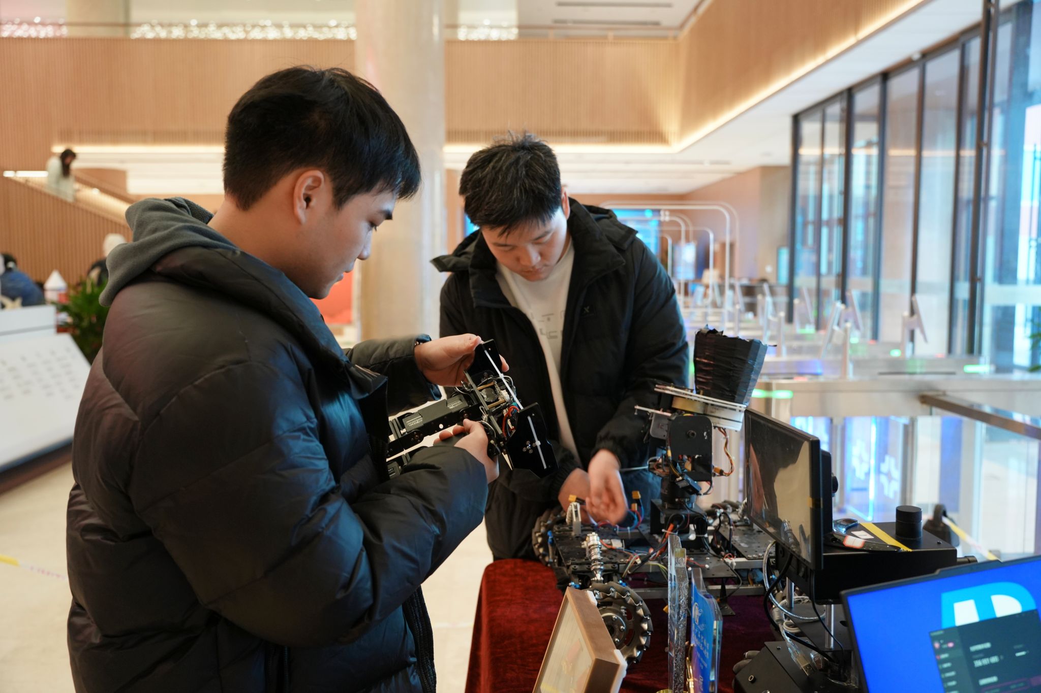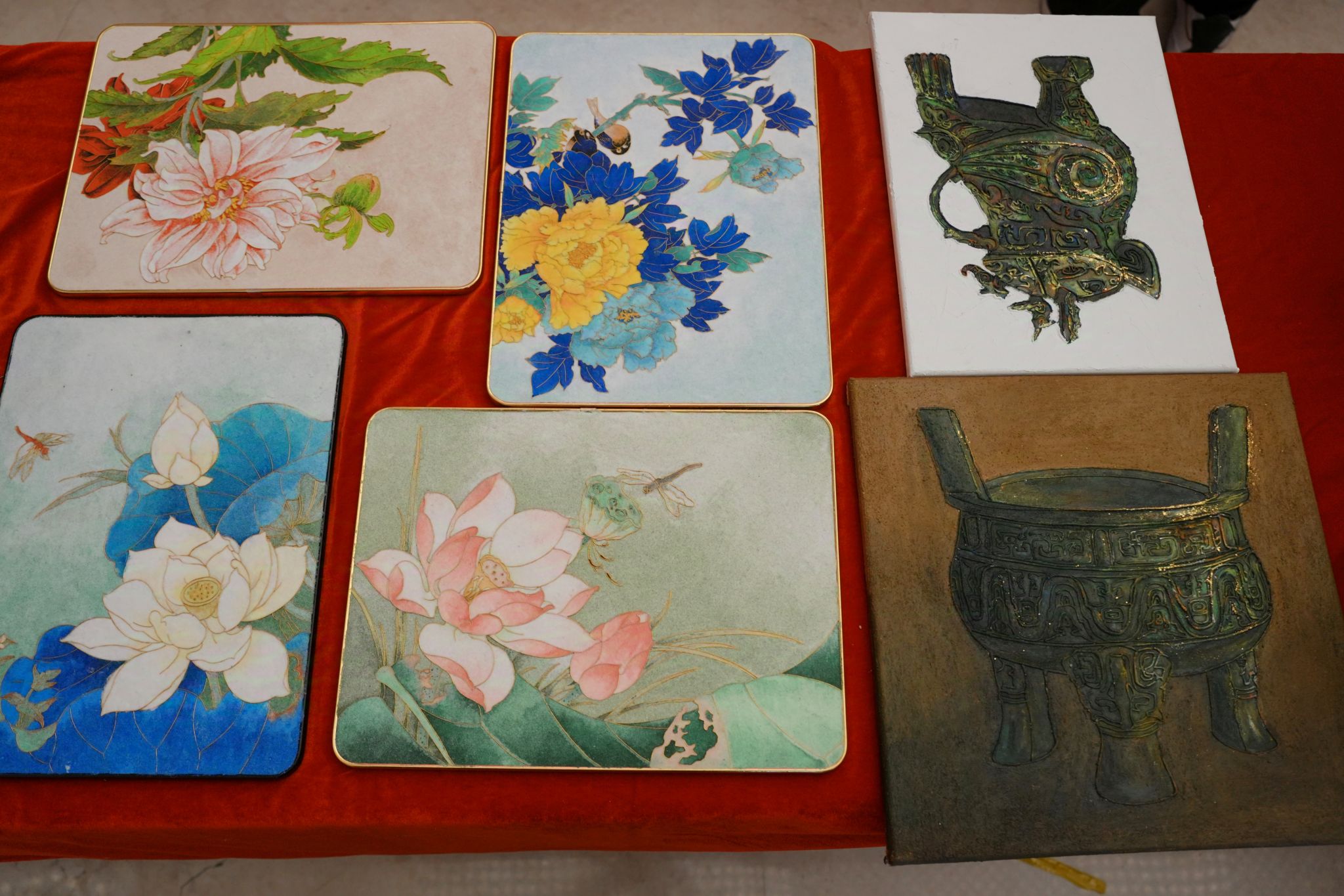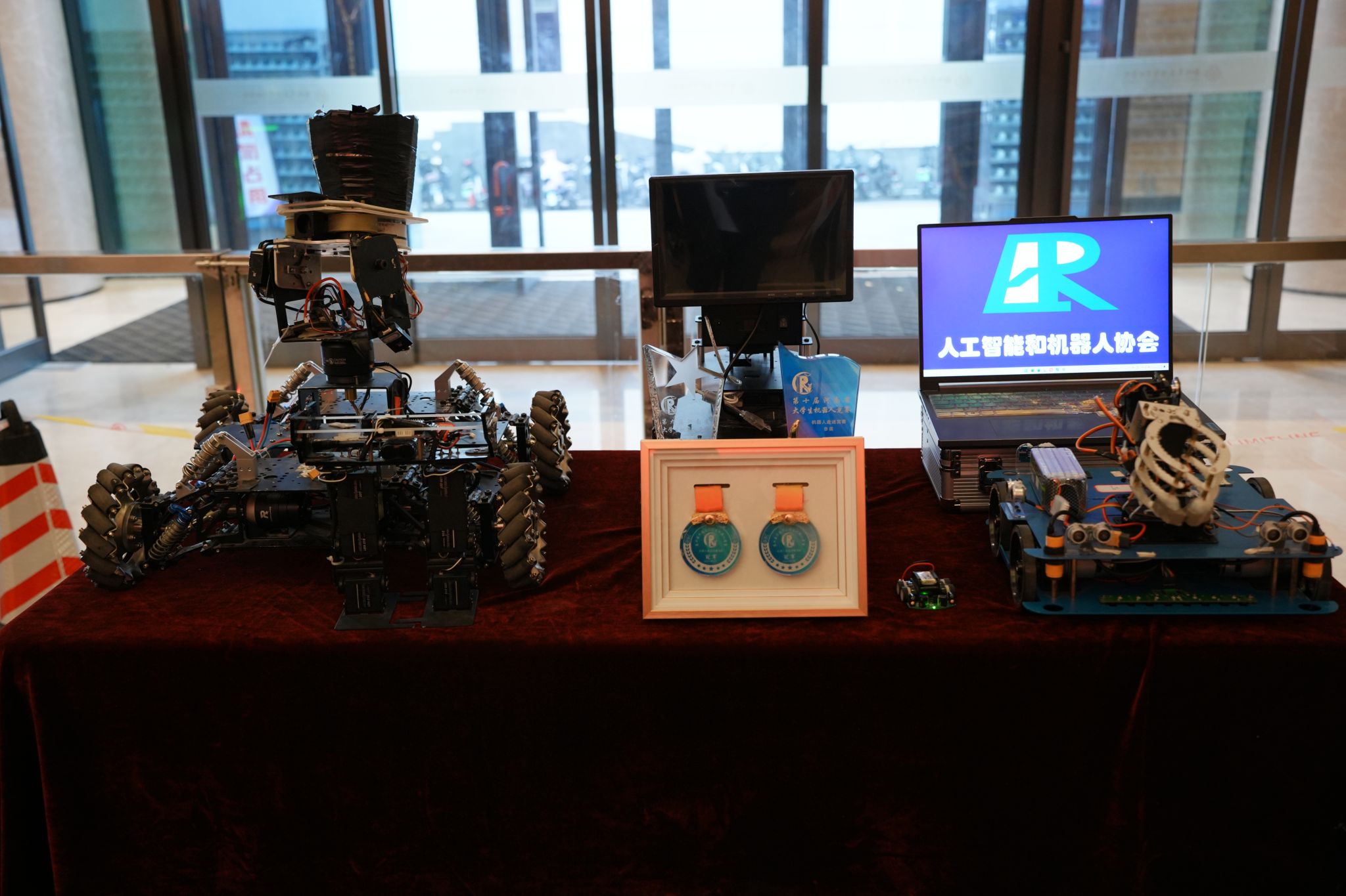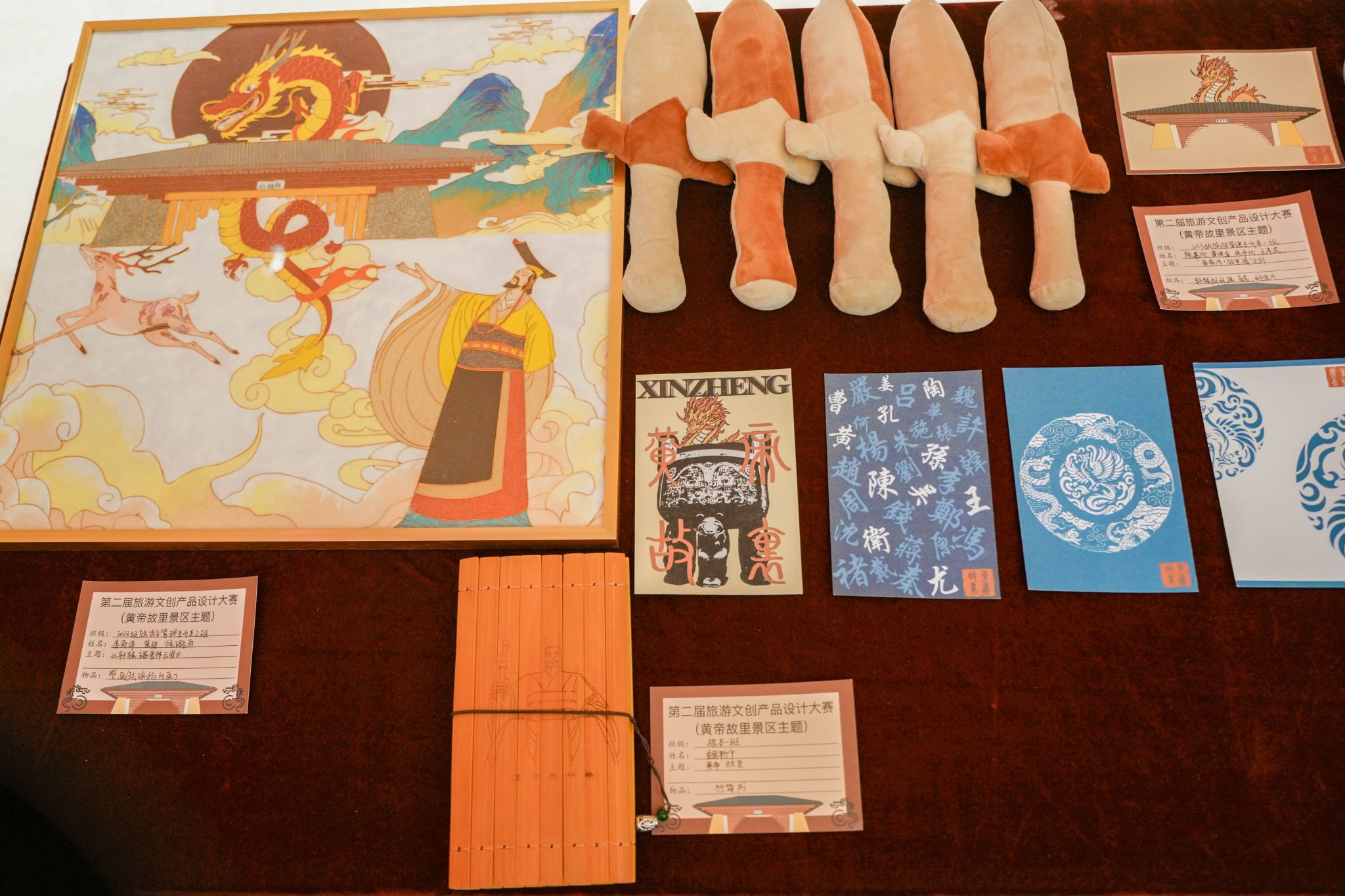 在专业劳动作品模块,作品突出体现“专业劳动与创新创造的深度融合”,分别展示了管理学院的旅游文创作品、艺术学院的环境艺术设计作品和信息工程学院的机器人作品。管理学院的旅游文创劳动作品是根据黄帝故里主题设计的一系列富有创意和文化内涵的文创产品。譬如非遗技艺掐丝珐琅画-轩辕瑞兽祥云图、传统非遗化作-烧箔画系列、黄帝竹简笔记本、明信片与植物盲盒系列、彩箔梳妆婚嫁系列以及掐丝珐琅首饰文创等。艺术学院参展作品围绕家居环境设计展开,有北方民居景观模型、别墅园林景观模型、掐丝彩砂作品(宋代花鸟画素材)、壁画沥粉工艺制作的青铜器装饰画、木质工艺装饰设计作品、红木镶嵌玉石刻字象棋等,作品精彩纷呈,展现了高超技艺和创新精神。信工学院参展作品更是呈现全明星阵容,VEX机器人曾获得第九届河南省机器人大赛扭转乾坤赛冠军,迷宫机器人获得第十届河南省机器人大赛迷宫赛B组冠军,无人车获得第二十六届人工智能和机器人大赛国家一等奖和第六届全球校园人工智能算法精英赛国家一等奖。