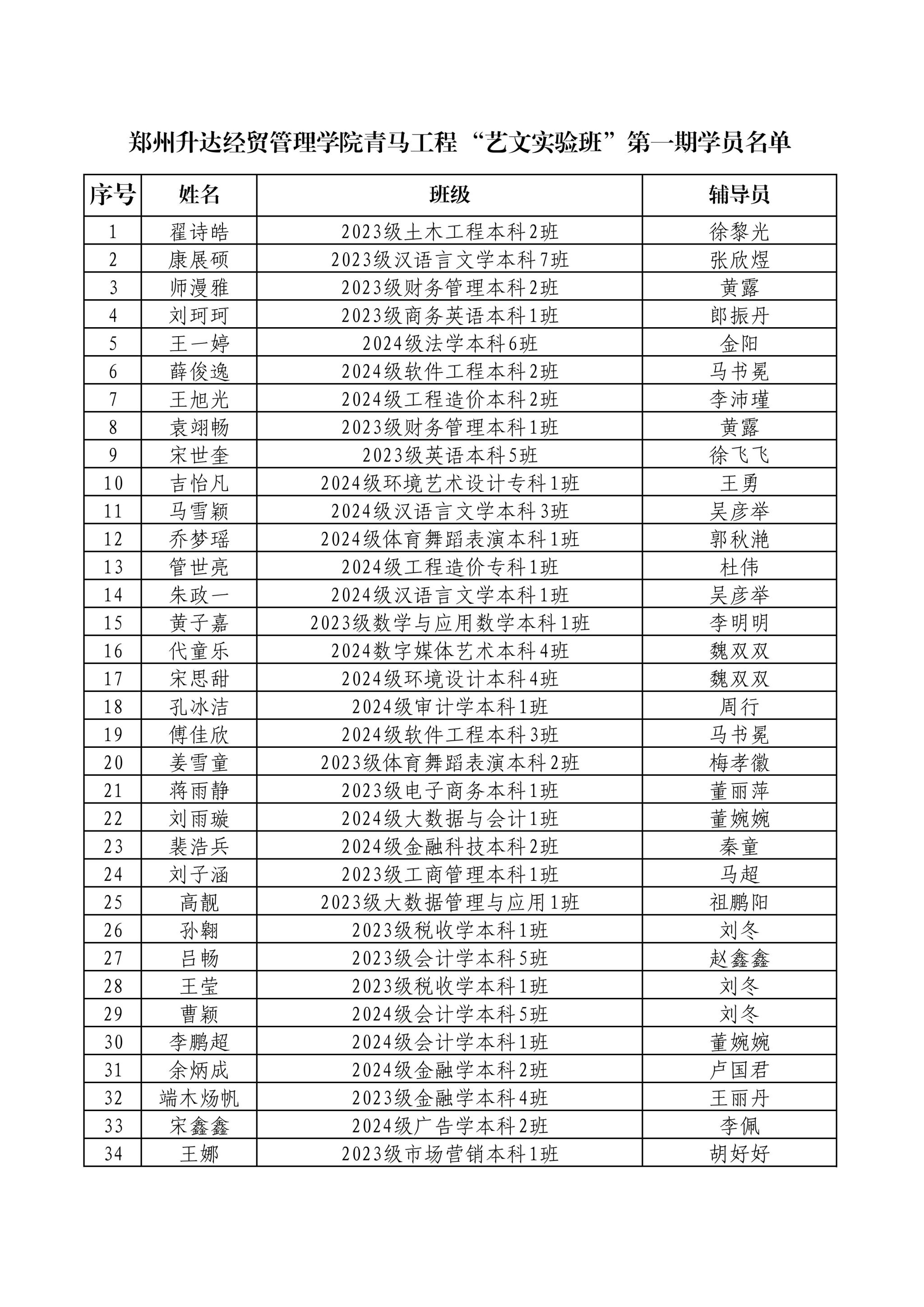 郑州升达经贸管理学院青马工程“艺文实验班”第一期学员名单公示