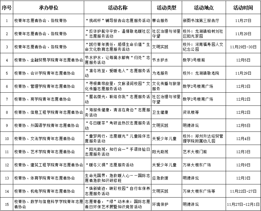 为弘扬“奉献、友爱、互助、进步”的志愿精神,推动我校志愿服务工作在新时代创新发展,迎接第40个国际志愿日,营造“人人愿为、时时能为、处处可为”的志愿服务活动氛围,将组织开展“12·5国际志愿者日”系列活动,现将有关活动通知如下: