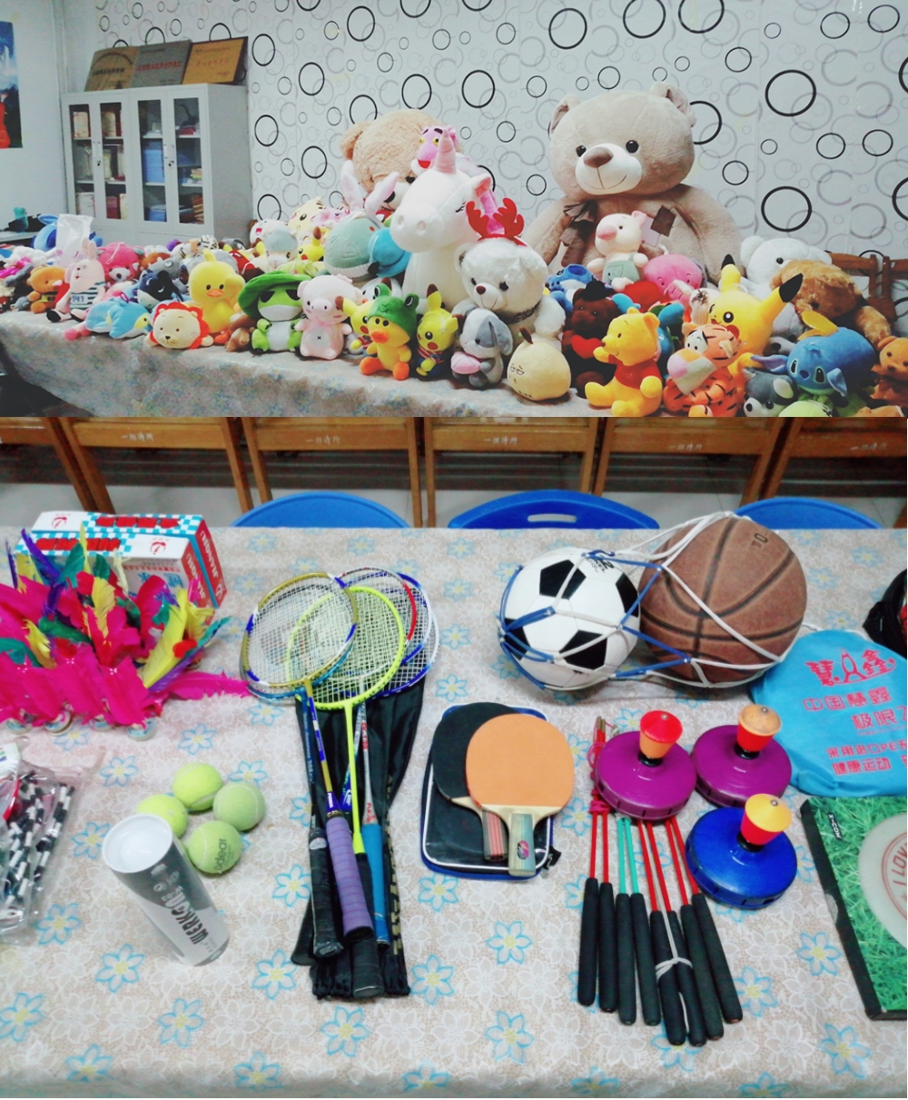 文具用品:本子95本、笔198支、墨水9盒、彩笔彩铅9盒、画笔34支、4个台灯、书包7个、益智游戏2盒。