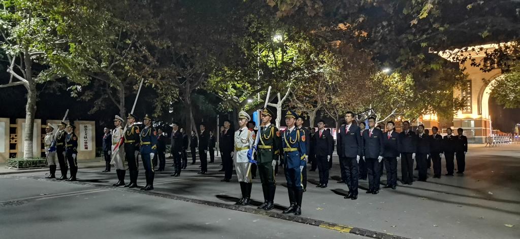 寒风萧瑟,青山含悲,仪式开始,校广播站播放纪念南京大屠杀死难者国家公祭日悼词,6点27分,我校第26届国旗班齐步出场,他们步伐铿锵,目光坚毅,口号响亮走向国旗杆前,国歌声响起,在师生注目礼中,鲜艳的五星红旗冉冉升起,国旗到达旗杆顶端,停留数秒钟后,在全场师生的静默注视下,国旗班队员将国旗缓缓降到下半旗的位置,随后,在广播防空警笛警示声中,全体师生默哀一分钟,向83年前遭受侵华日军杀戮的三十万同胞沉痛哀悼,向为中国人民抗日战争献出宝贵生命的无数革命先烈和民族英雄默哀。