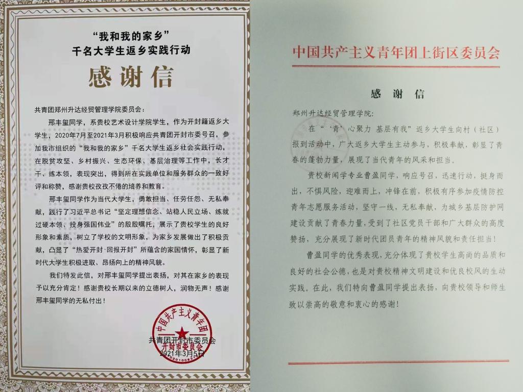 假期以来,我校陆续收到全国、全省各地共青团、基层社区发来的感谢信、荣誉证书210多份,这一封封感谢信是对我校学子参与“‘青’心聚力基层有我”返家乡社会实践的肯定,更是我校坚持立德树人、注重实践育人的生动展示。