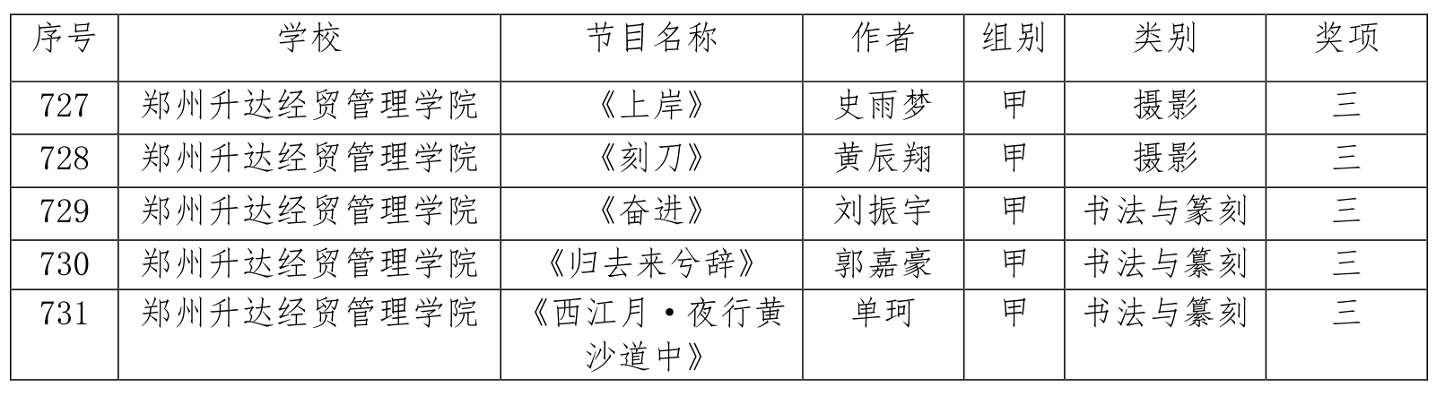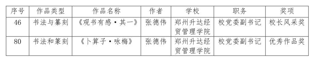 上学期,根据河南省教育厅通知要求,在校领导的大力支持下,校团委牵头,艺术学院、各学院积极筹备,在较短的时间内完成了宣传动员、作品选拔指导和上报工作。我校师生共在艺术表演、艺术作品、校长书画摄影作品等三项赛事中获得奖项。其中,校党委副书记张德伟同志的两件书法作品分别荣获“校长风采奖”和“优秀作品奖”,并入选全国第六届大学生艺术展演现场展演。在艺术表演类别中,由陈刚、林欣馨老师指导会计学院选送的舞蹈作品《花儿为什么这样红》,刘爽老师指导会计学院选送的短剧作品《找回诚信》,由沈雨、王叶、邬治国老师指导艺术学院选送的器乐作品《走向复兴》,荣获二等奖;另有金贸学院选送的舞蹈作品《胜利的曙光》、精舞门社团选送的舞蹈作品《吾》、升光书画社选送的书法作品《奋进》、安琪摄影协会选送的作品《上岸》等,获得艺术表演类、艺术作品类三等奖。