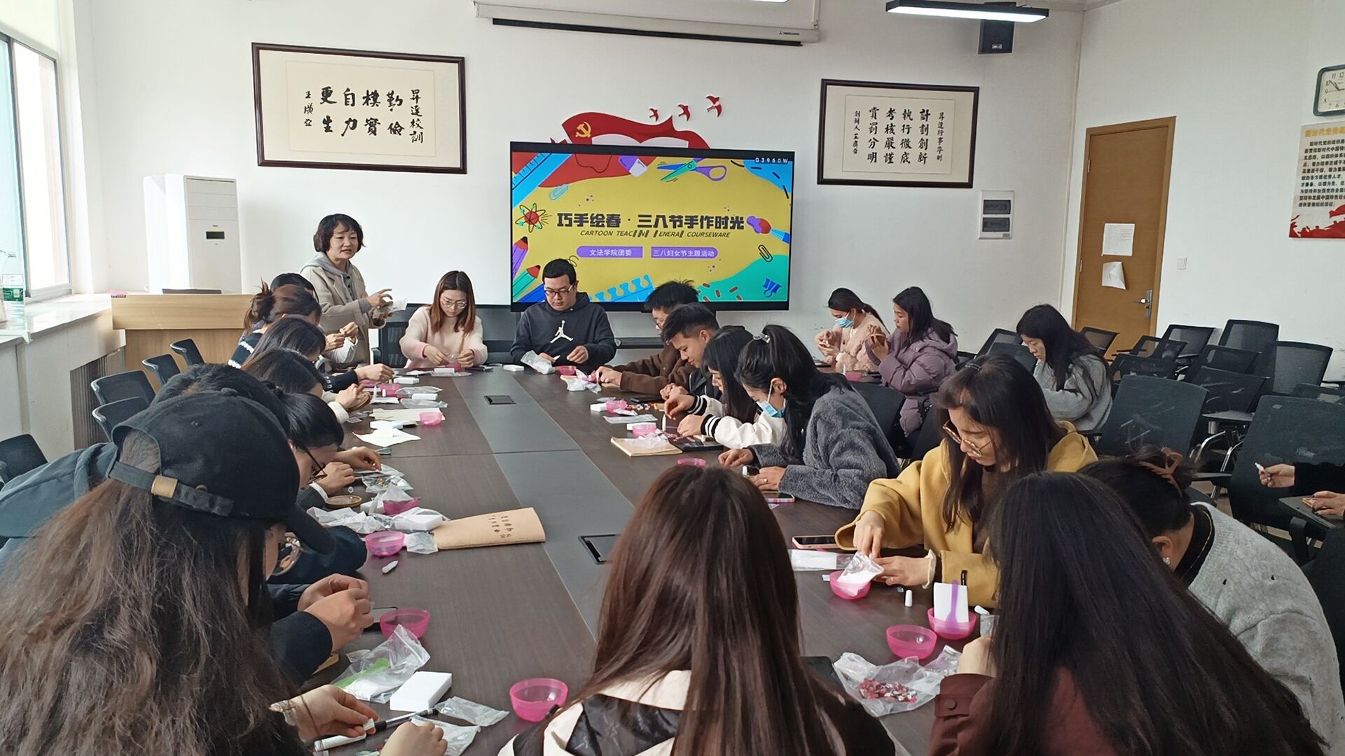为庆祝三八妇女节,弘扬传统节日,培养大家的创造思维。3月10日上午10点,由文法学院团委主办的“巧手绘春·三八节手作时光”活动在教学1号楼314教室开展。文法学院团委书记郑玲玲,学院全体教师团干部和部分学生参加本次活动。