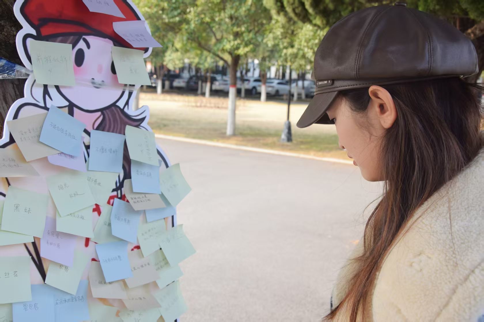 活动现场布置以大树为造型,展板环绕四周,氛围温馨。同学们踊跃参与,将代表不合理认知的标签一一撕下,随后写下“坚韧无畏的探索者”“智慧闪耀的领航员”等对自我全新诠释的寄语。撕下的标签被有序贴在一旁的展示区,与新写下的自我寄语进行对比,显示了同学们对自我更深刻的认识。
