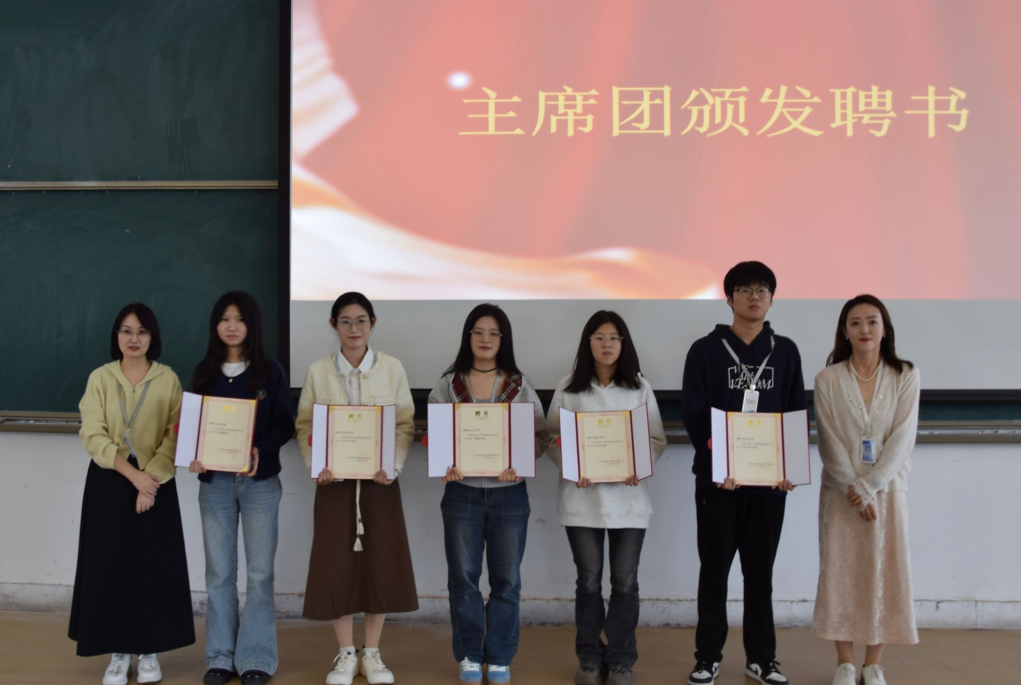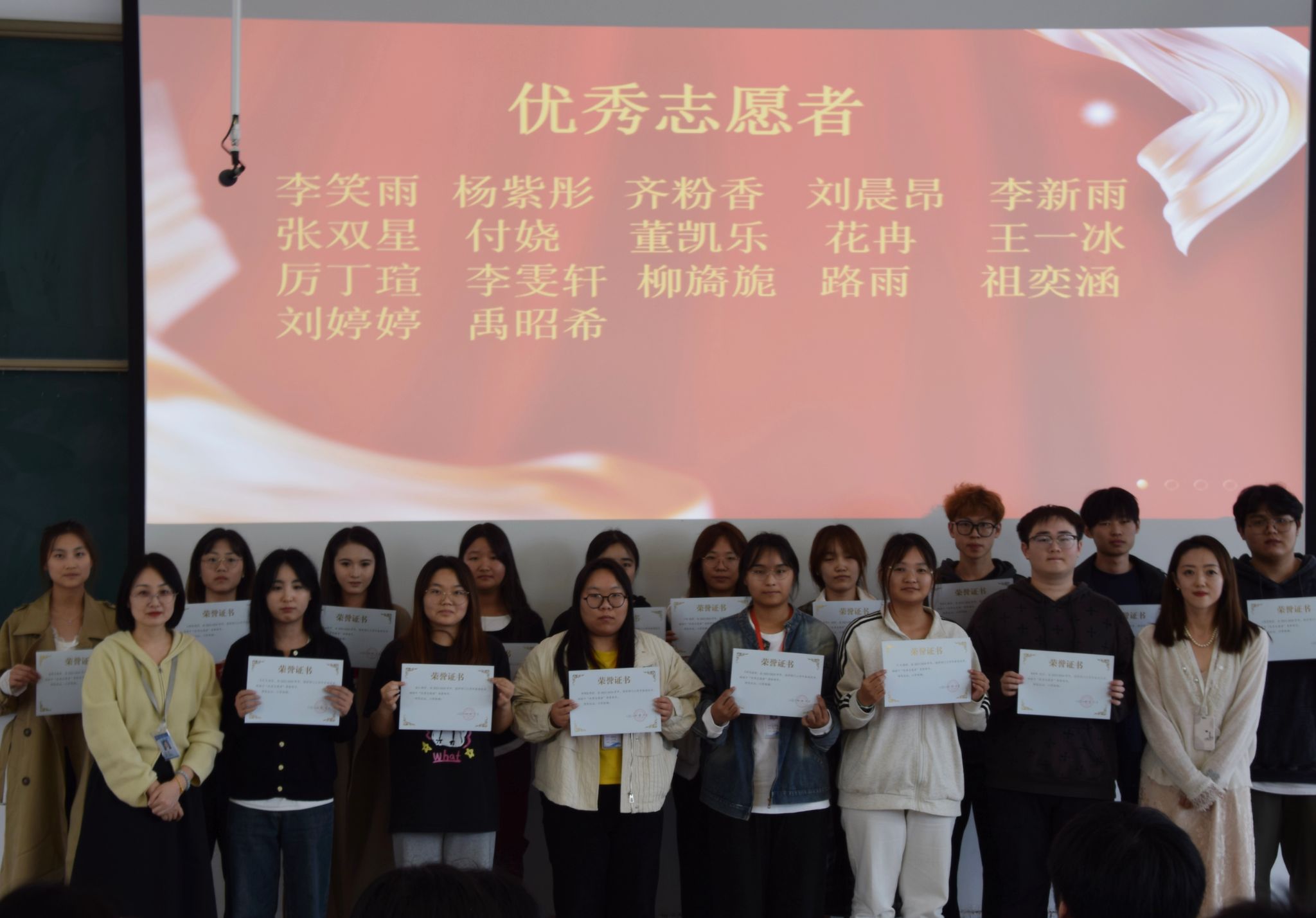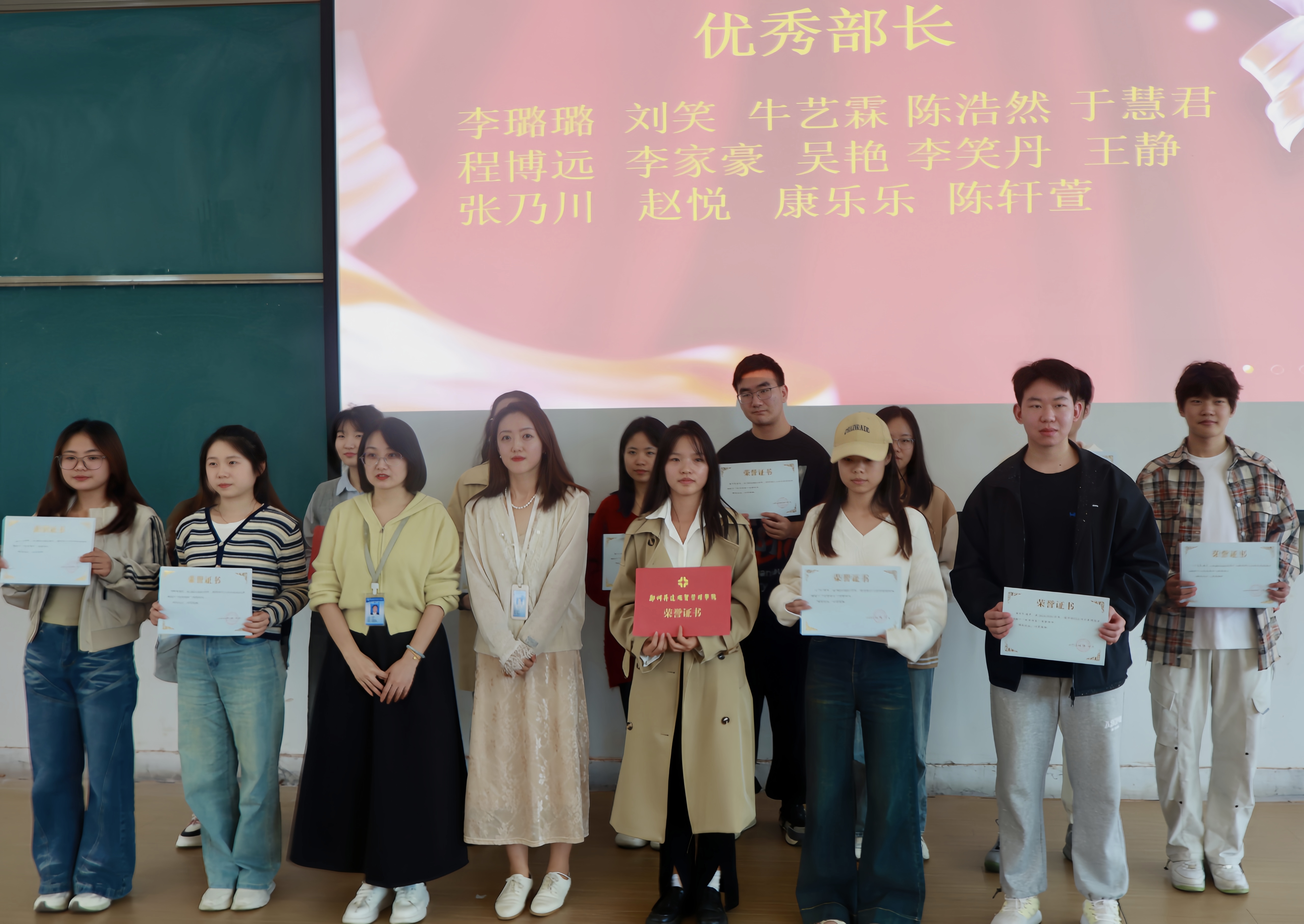 紧接着,由行政秘书兼团委书记丁玥老师和团委副书记武珍毅老师为获得“优秀部长”、“优秀志愿者”颁发荣誉证书,并与他们合影留念。