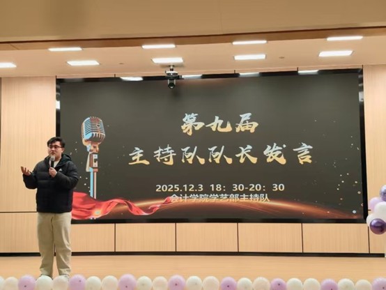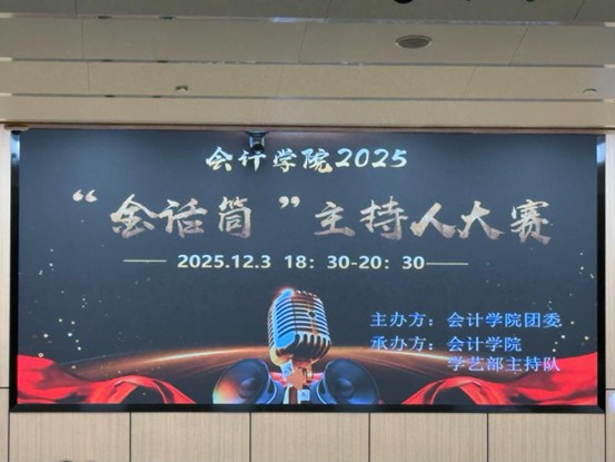 为响应学院文化建设号召,丰富学院文化生活,发掘与培养具有综合素养的主持人才。12月3日18:30,由会计学院团委主办、会计学院学艺部主持队承办的2025年“金话筒”主持人大赛于新图书馆二楼一号报告厅顺利举办。会计学院党委副书记兼团委书记陈刚老师,会计学院第30届团委办公室主任周晓梦,会计学院第31届主要团学骨干,第九届主持队队长朱君毅以及第九届主持队副队长陈燕出席本次活动。