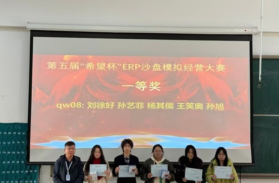 为培养学生的专业能力和综合素质,提升会计学子理论联系实践的能力,11月29日,由会计学院团委主办,会计学院ERP沙盘协会承办的第五届“希望杯”ERP沙盘模拟经营大赛在商管楼312教室举办,并于12月3日在教学四号楼118教室举办了颁奖仪式。参与此次颁奖仪式的嘉宾有会计学院党委副书记兼团委书记陈刚老师,会计学院团委副书记胡淑娟老师,ERP沙盘协会指导老师崔杰老师,社团管理中心主任孙翱以及社团管理中心副主任王莹。
