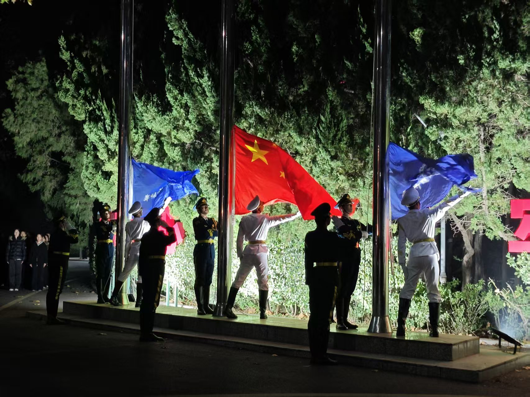 6时29分,升国旗、奏唱国歌。在全体师生的注视下,鲜艳的五星红旗伴随着朝阳冉冉升起,迎风飘扬。场面肃穆而激昂,传递出国旗班成员对祖国的无限热爱与忠诚。