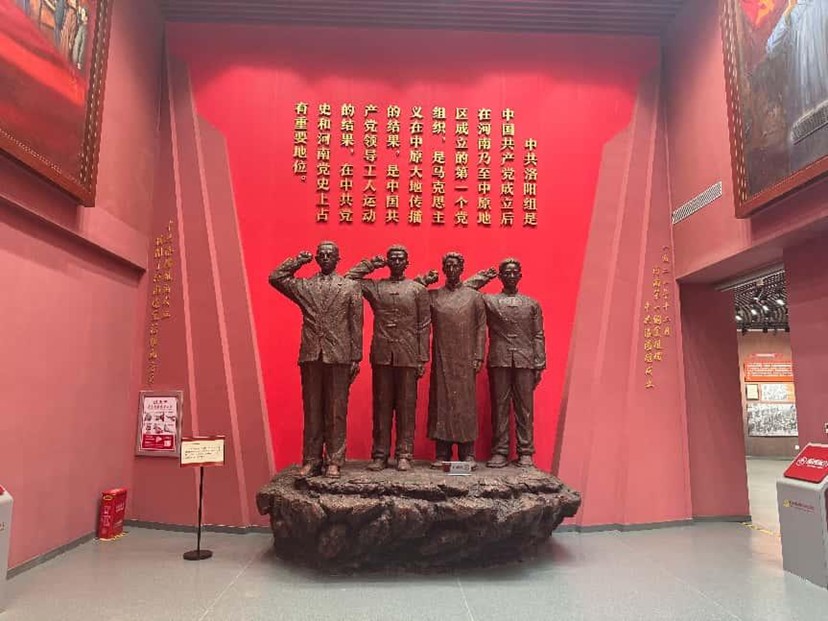 展柜中,《中共中央执行委员会书记陈独秀给共产国际的报告》等文献,成为实践团解码历史的 “密钥”。法学专业学生黄熙俯身逐字研读,不时与同伴围坐讨论:“从罢工组织到思想宣传,先辈们以实际行动深刻诠释‘为人民谋幸福’的宗旨,这对我们理解法治精神与青年担当深具启发。” 在中共洛阳组雕塑群前,成员们凝视着雕像坚毅的眉眼,恍惚间似穿越时空,与百年前的革命者隔空相望——能清晰感受到他们面对党旗时的赤诚与坚定,能触摸到那份“为信仰赴汤蹈火”的滚烫初心。无声的对视中,红色信仰的种子悄然在年轻心灵扎根,慢慢生长为“承继使命”的坚定力量。