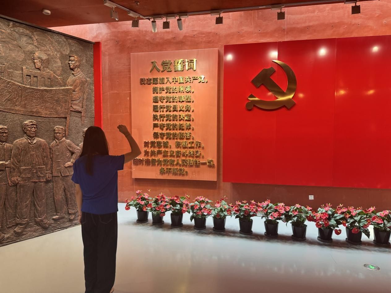 实践团不仅是历史的 “见证者”,更是红色精神的 “传承者”。活动期间,队员们分组梳理馆藏的红色故事,策划通过短视频、推文等形式向同龄人传播这段革命历史。汉语言专业李梓彤同学表示:“我们将发挥专业所长,创新叙事方式,让红色故事在当下焕发活力,让更多人了解中原大地的革命火种。”离馆当日,全体成员面对党旗庄严宣誓,“以青春之我,传革命星火” 的誓言掷地有声,将红色传承刻进青春使命。