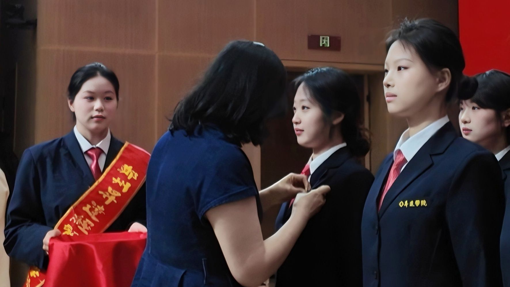 国旗班校外指导员曾嵘和校内指导教师王佳为新一届国旗班代表佩戴班徽。