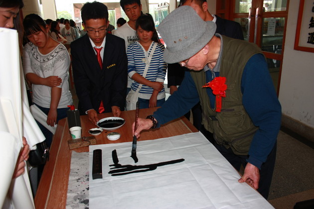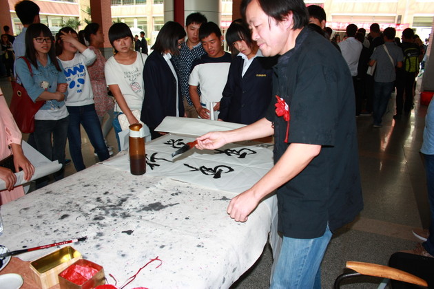 仪式结束,书画家们在图书馆大厅现场泼墨赠宝,许多同学前来欣赏技艺、索字求宝。画家们的精湛书艺令大家兴奋不已,拍手称赞。