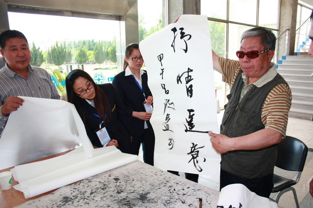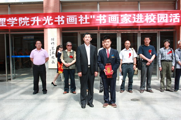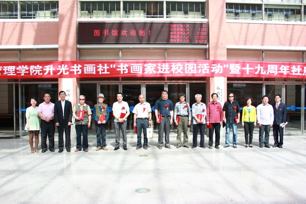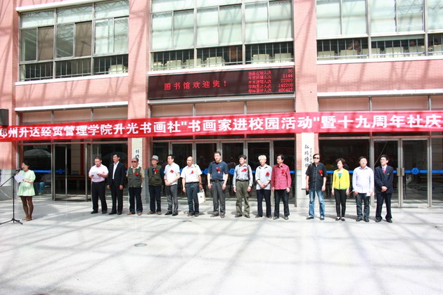 5月15日,我院升光书画社在图书馆大厅举行升光书画社19周年社庆活动。特邀郑州书画研究院院长、郑州大学吕志远教授等 7位画家来院泼墨赠宝。院党委常务副书记戎庭银、院团委书记王红晓,南大学城各个高校的书画社社团代表及我院师生代表200余人参加活动,仪式由院团委副书记胡芳主持。