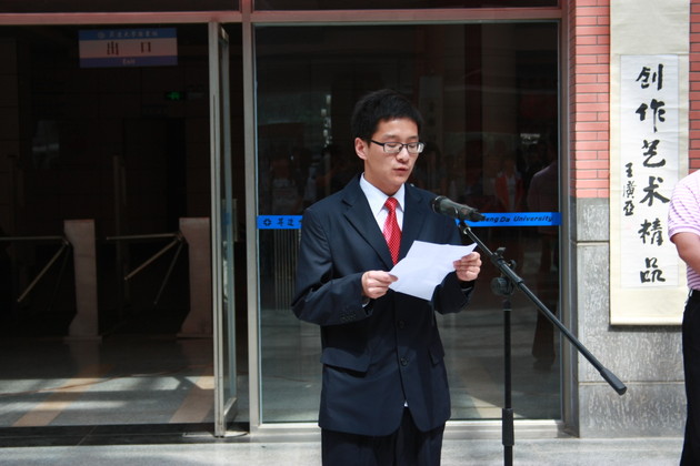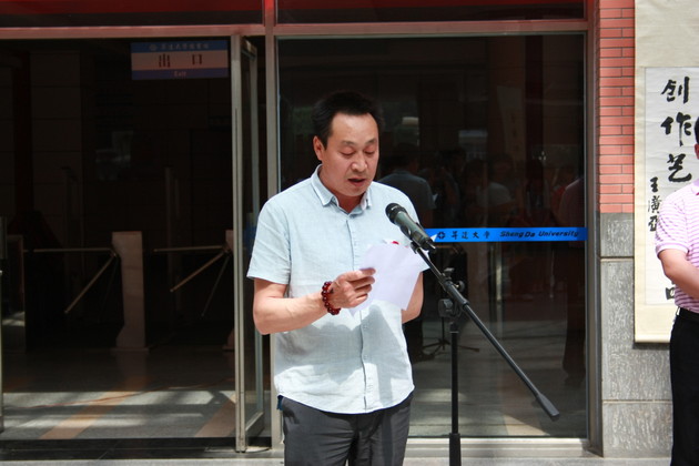 书画家代表李显国老师讲话,他赞扬我院此次活动是大学生践行中华文化的良好范例,期望升达学子在书画艺术上取得更大进步。