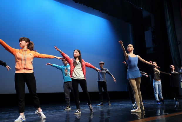 一阵热烈的掌声过后,本次演出的报幕员、主讲,中央芭蕾舞团排练者、国家一级指导李宁女士走上台,她通过讲座的形式首先向观众介绍了芭蕾舞艺术的发展历史和不同学派,以及世界和中国的芭蕾舞现状。为了进一步让同学们直观的了解芭蕾舞的训练过程,李宁现场带领演员们进行简单的课堂训练,由浅入深、循序渐进向观众展示芭蕾舞演员幕后的基本功训练,并现场邀请同学们体验芭蕾舞演员的几个训练环节,同学们争相上台参与互动。