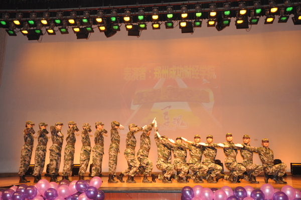 晚会在异域风情十足的舞蹈《天竺少女》中拉开帷幕,曼舞妙姿,灵动活泼。歌曲《童话》深情款款,韵味十足。由郑州财经成功学院带来的舞蹈《军魂》着装帅气,动作铿锵有力,气势昂扬奋发,将晚会的气氛推向第一次高潮。