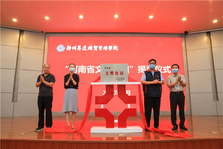 揭牌仪式上,孙现民主任宣读了河南省委、省政府《关于表彰2017-2019年度河南省文明城市文明村镇文明单位的决定》。张慧娴部长、孙现民主任和我校王新奇执行董事、张德伟书记共同为我校“河南省文明校园”揭牌。