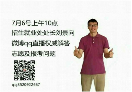 “与时俱进玩直播,心系考生讲规则。”2017年7月6日上午十点,招生就业处刘景向处长通过微博、qq直播,向广大考生权威解答报考及志愿填报问题。