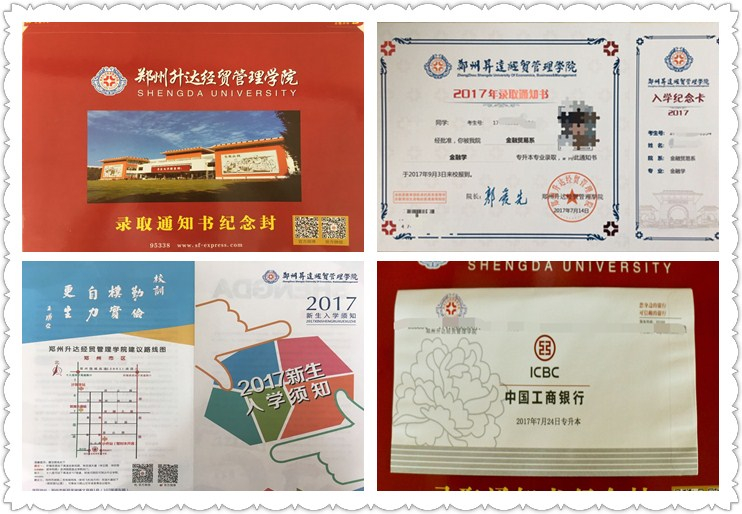 我院2017年录取通知书顺丰邮寄包裹内容:1、录取通知书;2、新生入学须知;3、中国工商银行卡;4、银行卡使用指南;5、高等学校学生资助政策简介;6、高等学校学生及家庭情况调查表。6、大学生应征入伍宣传单7、心理健康教育中心《致家长的一封信》。