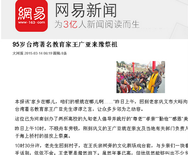 网易新闻:《95岁台湾著名教育家王广亚来豫祭祖》