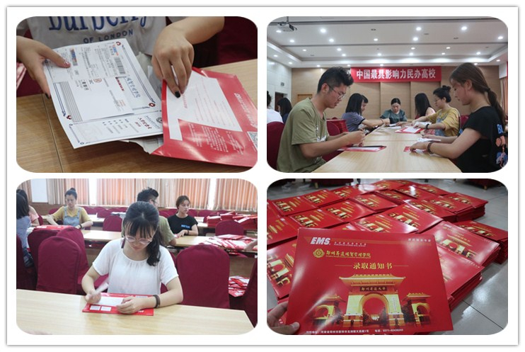根据各省招生主管部门录取安排,我校相继完成河南省内专升本、提前批体育类本科、提前批艺术B段、内蒙古艺术本科、安徽省艺术本科、山东省艺术本科和四川省艺术本科等批次录取工作。学校为准确、及时邮寄被我校录取考生的录取通知书,7月23日上午,招生办公室已经完成首批(河南省内专升本和提前批体育类本科)录取通知书的分装和邮寄工作。