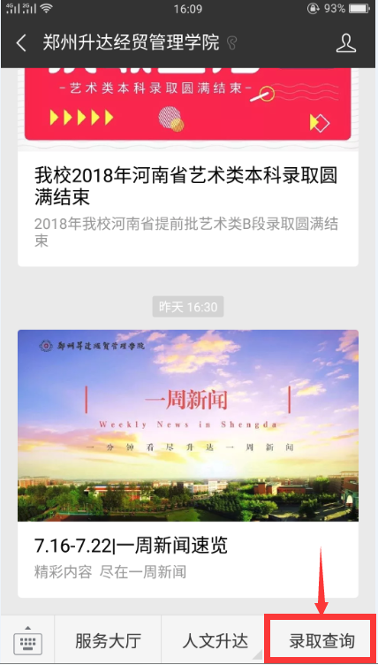 2、关注学校官方微信:shengda_university,点击底部菜单“录取查询”。
