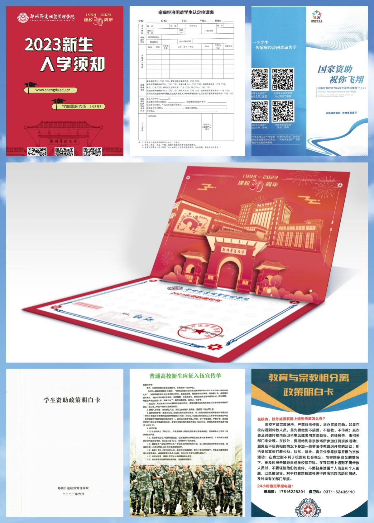 1、录取通知书;2、新生入学须知;3、河南省家庭经济困难学生认定申请表;4、河南省高校本专科学生资助政策简介;5、学生资助政策明白卡;6、大学生应征入伍宣传单、7、教育与宗教相分离政策明白卡。