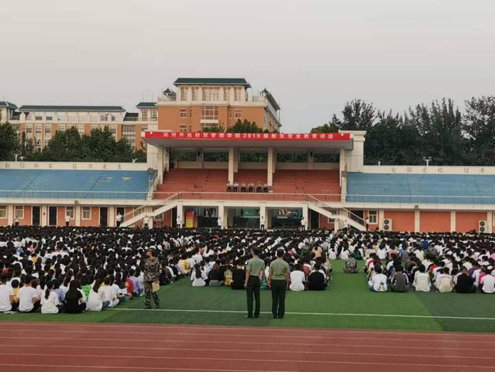 2019年9月8日下午17:30,郑州升达经贸管理学院2019级8000余名新生在军训期间及时开展了安全教育第一课。保卫科专门邀请了郑州市公安局犯罪侦查局反诈中心相冰警官、新郑市消防大队胡雷参谋、新郑市公安局大学办姚静警官及龙湖派出所领导等参加。讲座共分为两个议题:1、消防安全,2、校园防电信诈骗。