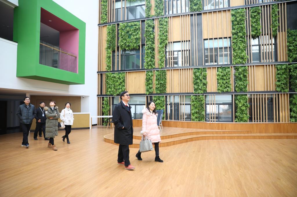 执行董事王新奇陪同来宾参观教学楼