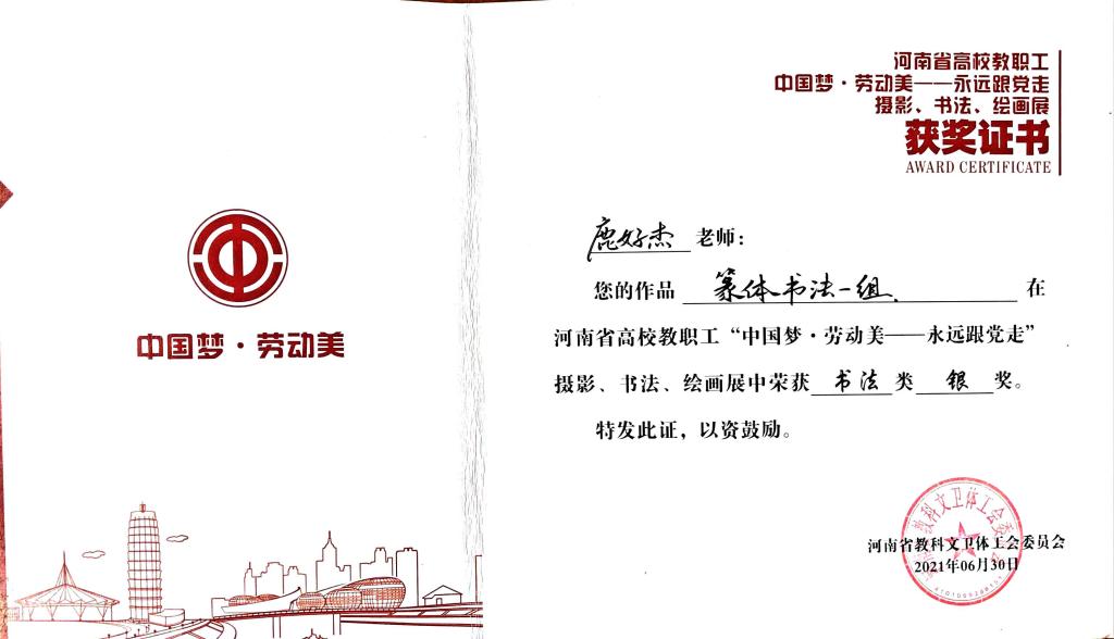 我校总务处同仁鹿好杰喜获河南省高校教职工“中国梦·劳动美—永远跟党走”摄影、书法、绘画展“书法类银奖。