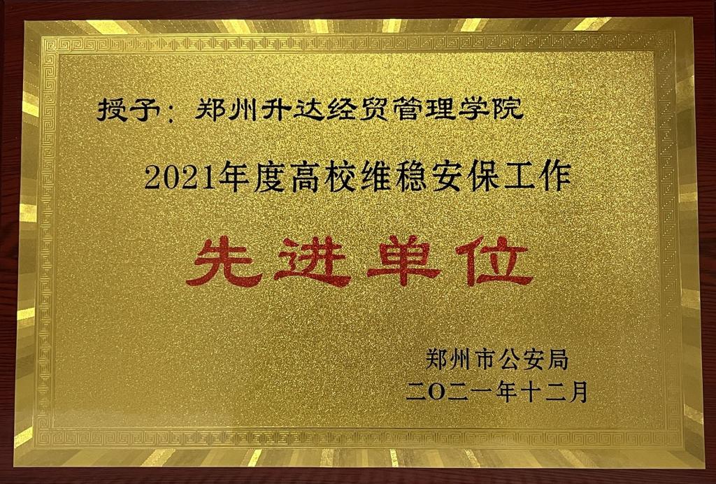 2021年12月30日,郑州市公安局下发《关于表彰2021年度高校维稳安保工作先进单位和个人的决定》(郑公通[2021]286号),郑州升达经贸管理学院荣获郑州市2021年度高校维稳安保工作先进单位,副校长兼总务长张其武、学务长张红阳、刘帅、王紫瑞被评为全市2021年度高校维稳安保工作先进个人。