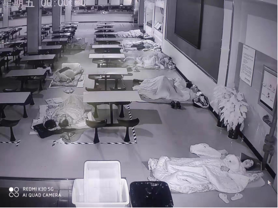 文萃苑餐厅瓦香鸡档口刘伟妻子魏艳艳身怀六甲,为保障加餐、服从安排,每天坚持在岗、默默奉献、毫无怨言,晚上累了就在餐厅打地铺休息。